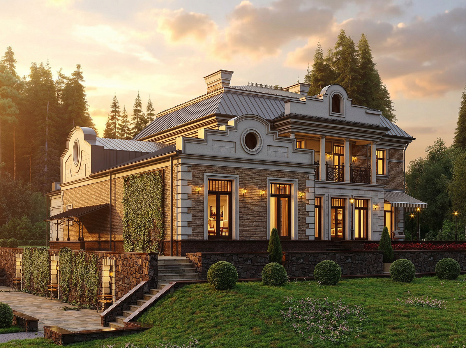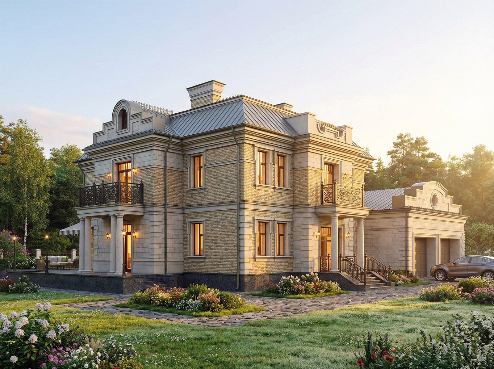 Дом рассчитан на круглогодичное проживание семьи из 4-6 человек. Материал стен - поризованный кирпич, отделка фасадов - облицовочный кирпич, натуральный камень. Фундаменты и перекрытия - монолитный бетон. Стиль фасадов - неоклассика.