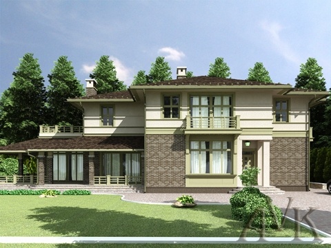 Проект двухэтажного кирпичного загородного дома. Площадь дома 330 м. кв. Отделка фасадов - декоративный кирпич, натуральный камень, дерево. Покрытие кровли выполнено из меди.